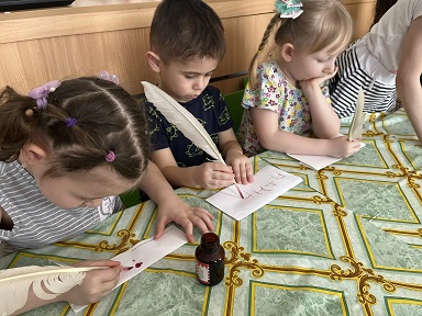 📖Экспериментальным путем мы убедились в трудности использования этих средств. Попробовали писать палочкой на пластилине. С большим интересом выводили буквы гусиным пером.