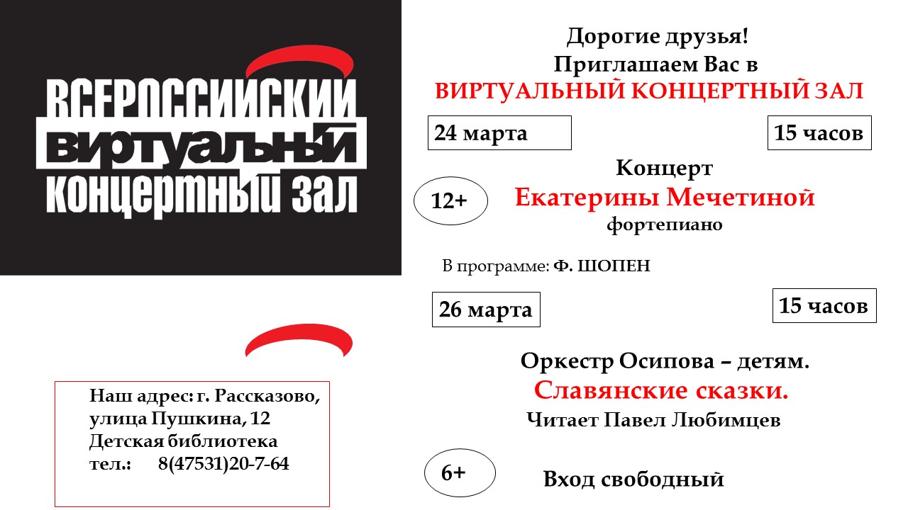 Афиша виртуального концертного залаДетская городская библиотека20.03.2026Анонс, Дети, Детская библиотека, Духовно - нравственное воспитание, Новости Количество просмотров: 13 Пред. Запись «Зеленый мир - наш добрый дом» След. Запись "Народные промыслы России"