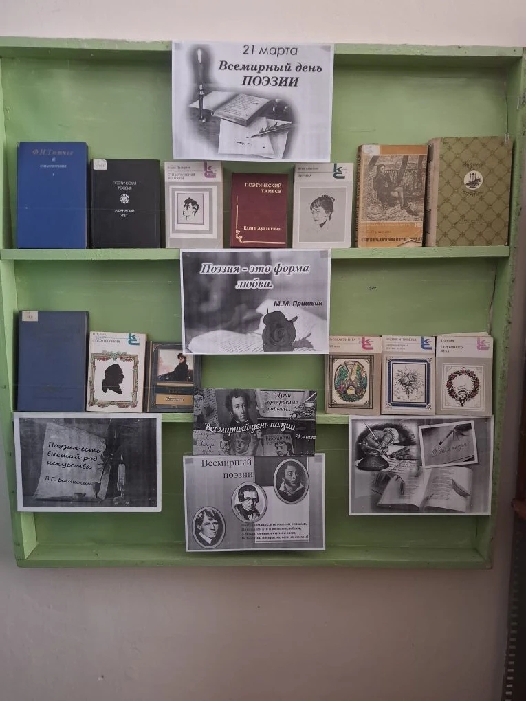 Книжная выставка ” Поэзия – это форма любви” к всемирному дню поэзии ждет своих посетителей в Зареченском сельском филиале. На выставке представлены произведения выдающихся русских поэтов.