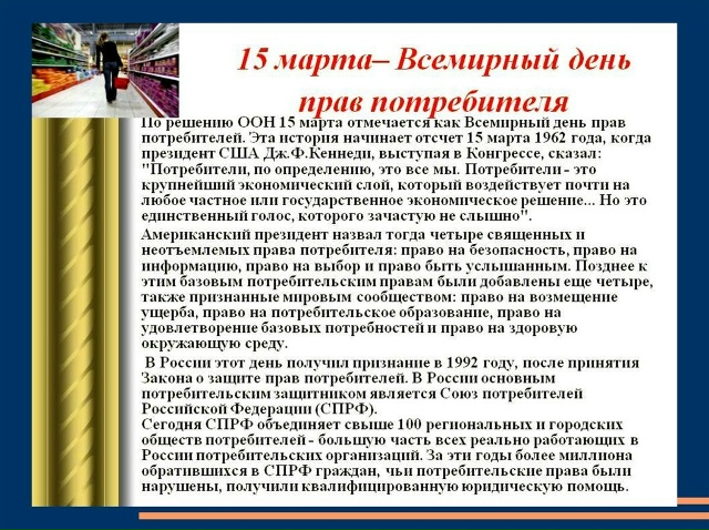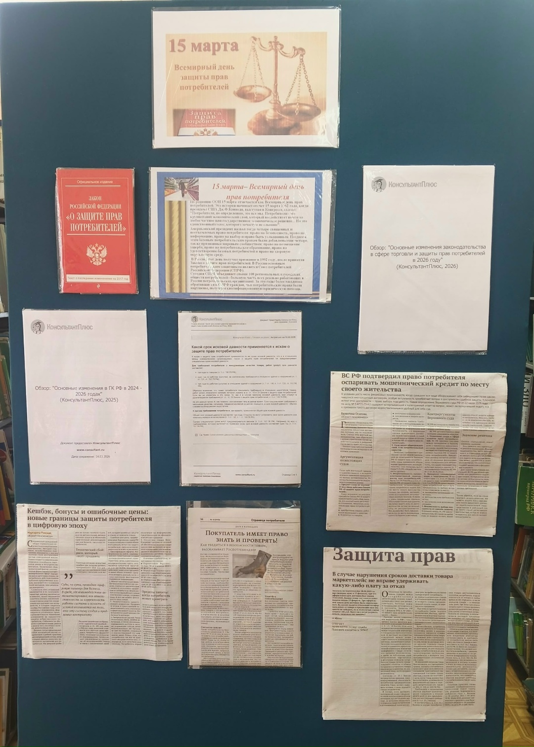 15 марта- Всемирный день защиты прав потребителей. К этой дате в центральной библиотеке оформлен стенд «Защита прав потребителей», на котором можно найти ответы на вопросы, возникающие по поводу защиты потребительских прав и ответы, касающиеся ответственности продавцов (изготовителю, исполнителю) за причинённый вред.