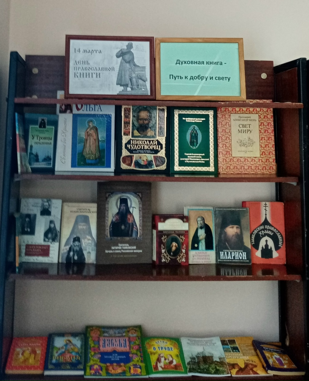Особое место занимает православная книга. Это литература, которая направлена на спасение души человека и наставление на путь совершенствования. Православная книга учит человека добру, милосердию, состраданию, воспитывает в нём любовь к Отечеству и родному очагу, позволяет увидеть мир во всём его многообразии и понять смысл жизни. В Изосимовском сельском филиале оформлена книжная выставка “Духовная книга – путь к добру и свету”. Где представлены книги рассказывающие о житие святых, книги священников о собственном духовном опыте, о церковных обрядах, православных праздниках. Приглашаем всех желающих посетить нашу библиотеку.