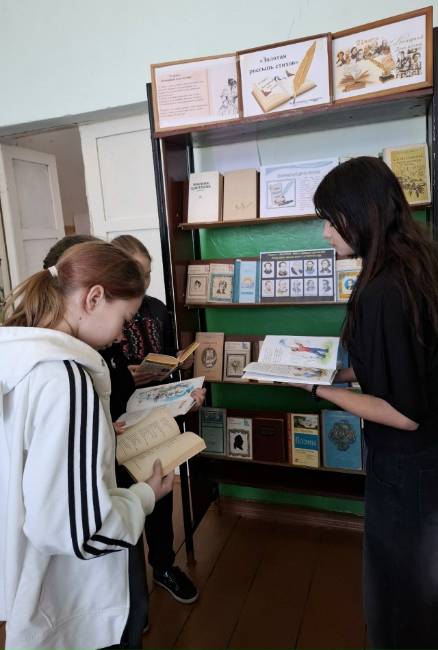 Вниманию читателей в Жидиловском филиале представлена книжная выставка “Золотая россыпь стихов”, с произведениями знаменитых русских поэтов, таких как А. Пушкин, С. Есенин, Н. Рубцов, М. Цветаева, А. Ахматова , А. Фет, М. Лермонтов, С.Есенин, и многие другие. Учащихся читали стихи и отрывки из великих поэтических произведений.