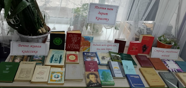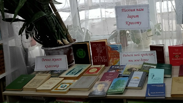 В Новоникольском филиале к этому дню оформлена книжная выставка “Поэзия нам дарит красоту”, которая позволит вновь прикоснуться к чарующим силам поэтического дара поэтов всех времён: С.Есенина, А.Ахматовой, Ф.Тютчева, Н.Рубцова и других.