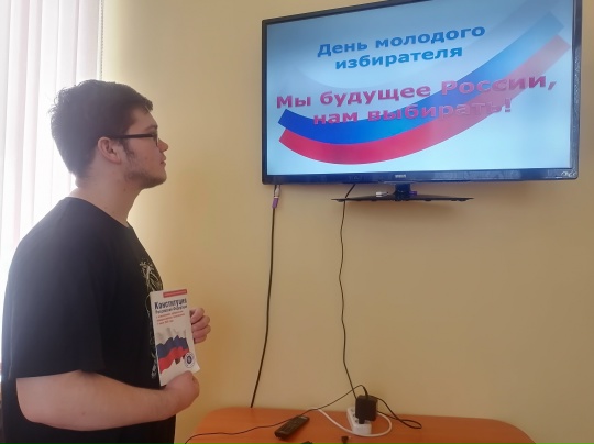 «Я молодой выбор за мной» – под таким названием в Староюрьевской детской библиотеке проведен урок права «Я молодой — выбор за мной!», посвященный Дню молодого избирателя. С помощью презентации библиотекарь Елена Крутских рассказала подросткам