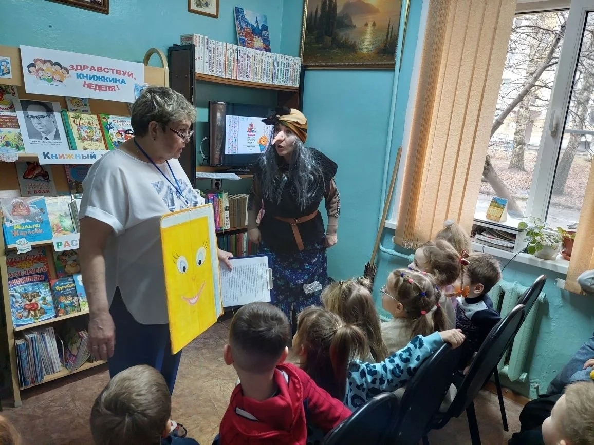 В библиотеке детей встретили библиотекарь и сказочная Баба-Яга. Библиотекарь рассказала о первой «Неделе детской книги», которая прошла в марте 1943 года в Москве по инициативе писателя Льва Кассиля. Тогда она длилась всего один день, но уже в 1944 году её продолжительность увеличилась до недели.