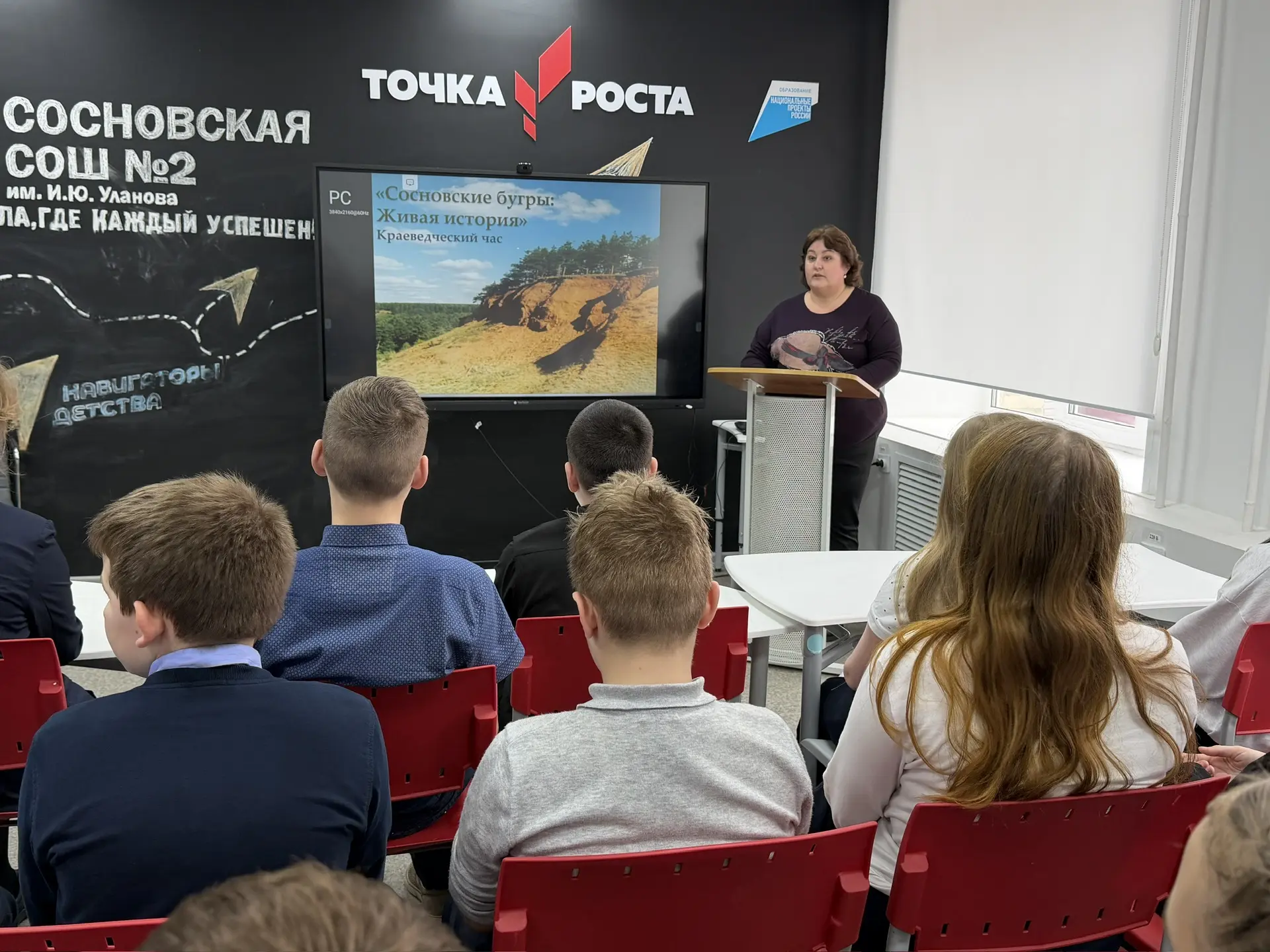 На базе центра образования цифрового и гуманитарного профилей образования «Точка роста» МБОУ Сосновской СОШ №2 им. И. Ю. Уланова сотрудником Сосновской центральной межпоселенческой библиотеки для учеников 6-Б класса проведен краеведческий час «Сосновские бугры: живая история». Ребятам рассказали о том, что стоит не забывать наших исторических мест, и чтить память, ухаживая за памятниками, обелисками, сохраняя и передавая будущему поколению. Также рассмотрели наиболее интересные памятники в России и те, которые находятся в нашем поселке. А затем библиотекарь подробно остановилась на главной жемчужине — Сосновских буграх. Тот самый памятник, который знают далеко за пределами нашего района. Кульминацией стал показ фильма о Сосновских буграх из которого узнали удивительные факты.