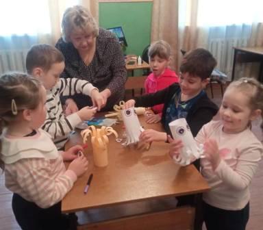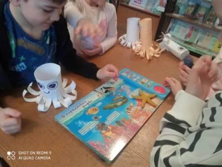 Из бумаги сделали с детьми осьминожек, рассмотрели говорящие книги, послушали шум большой ракушки.