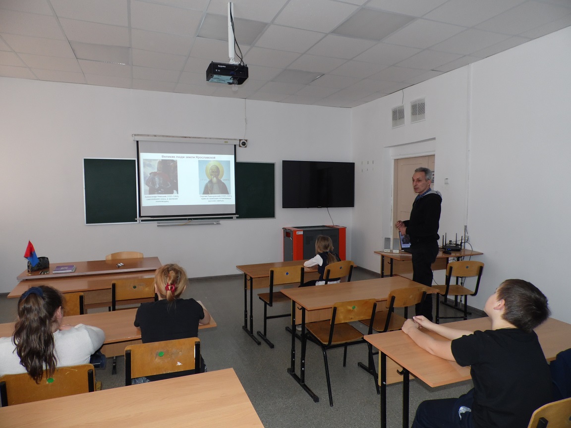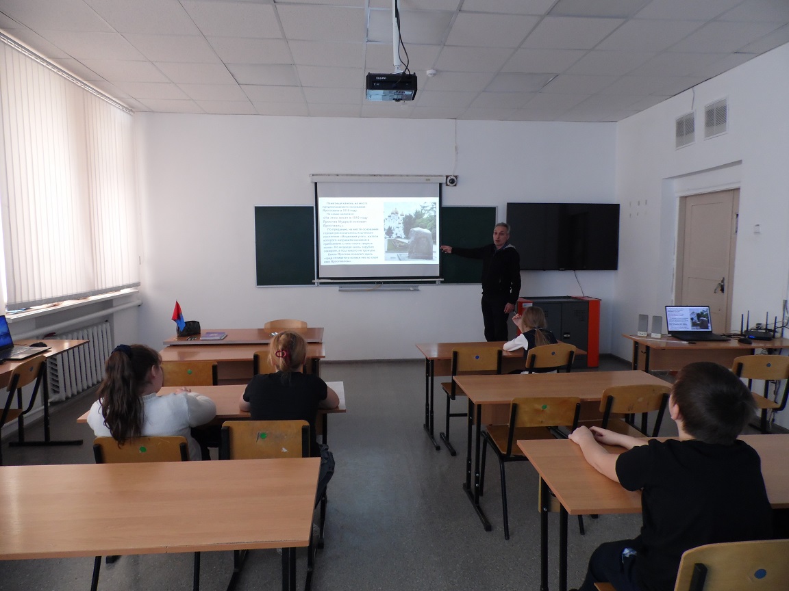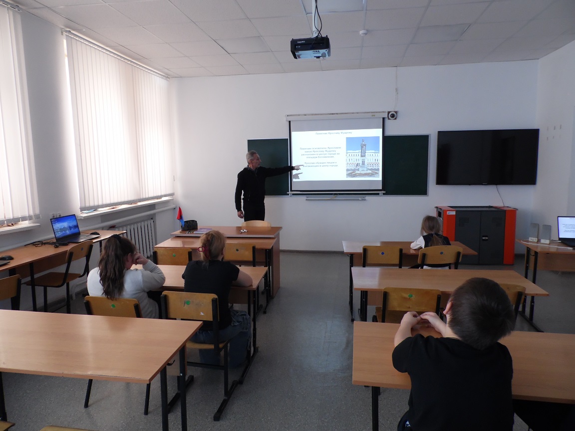 Заведующий библиотекой познакомил учеников с историей возникновения и развития этого легендарного города, основанного в 1010 году самим Ярославом Мудрым.  Прозвище Мудрый он получил за любовь к наукам и создание первого на Руси свода законов – «Русской правды». В «Повести временных лет» говорится о собрании книг и документов, которое принято называть Библиотекой Ярослава Мудрого, первой библиотекой на Руси.  К тому же он – отец, дядя и дед многих европейских правителей.