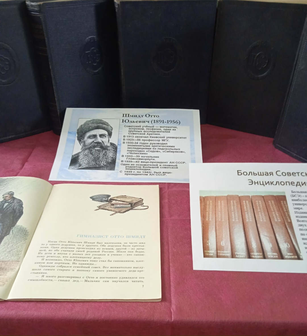 Посетив выставку читатели смогут узнать о том, что идея издания абсолютно нового на тот момент справочника принадлежит учёному- энциклопедисту, профессору, реформатору системы образования и науки Отто Шмидту.