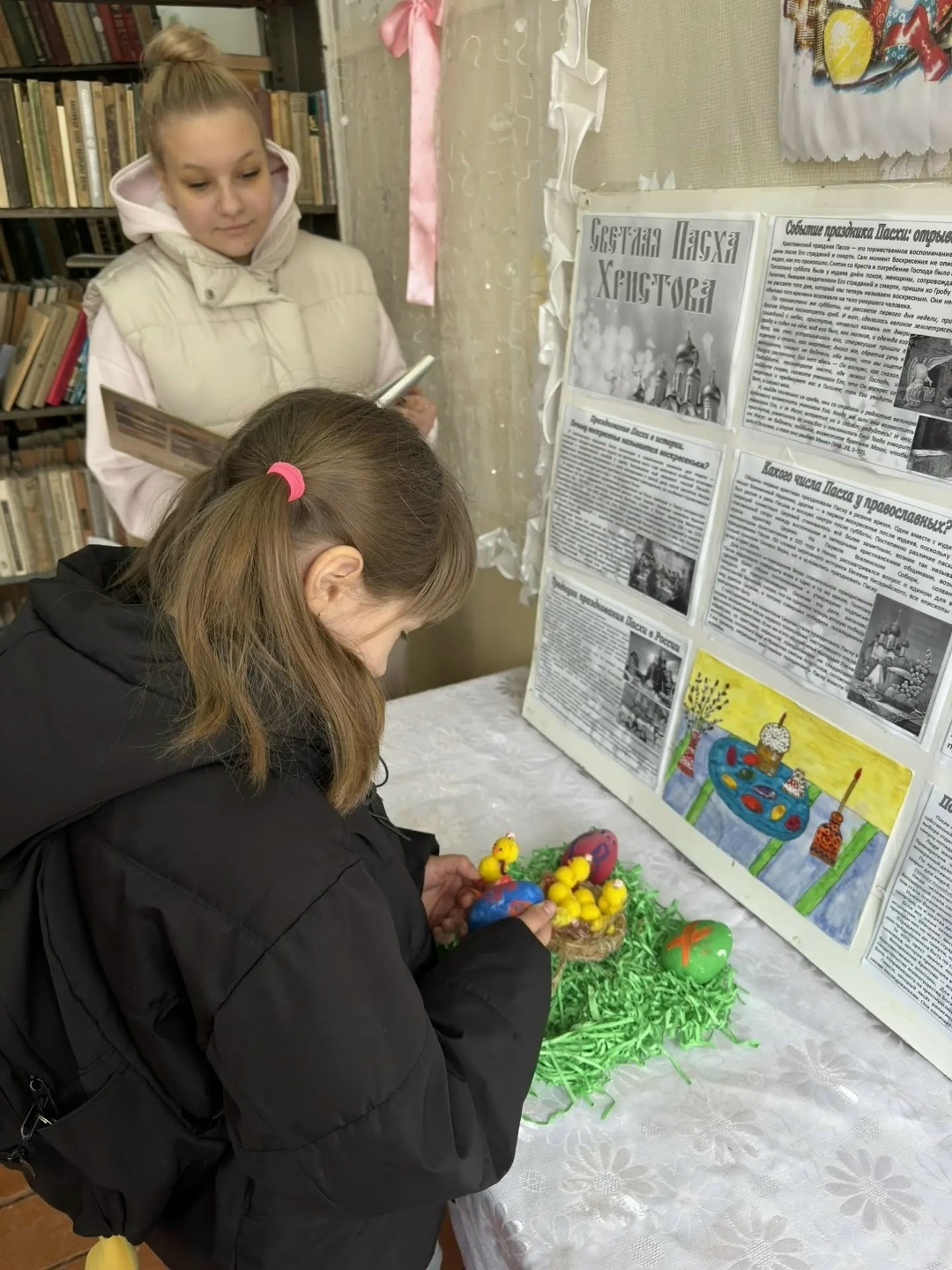 В библиотеке для всех желающих прошёл православный час «Святое Воскресение». Гости собрались у тематической выставки, где были представлены книги о Пасхе и литература о православных традициях.