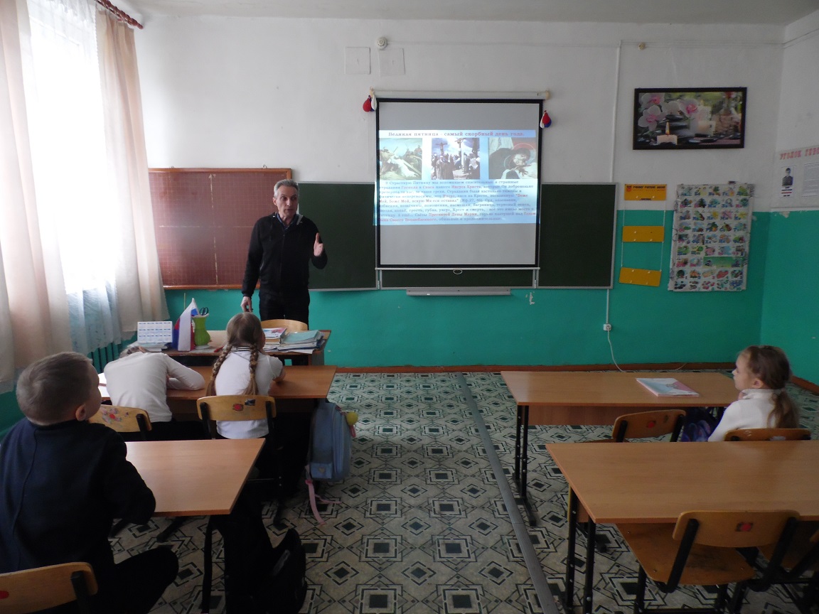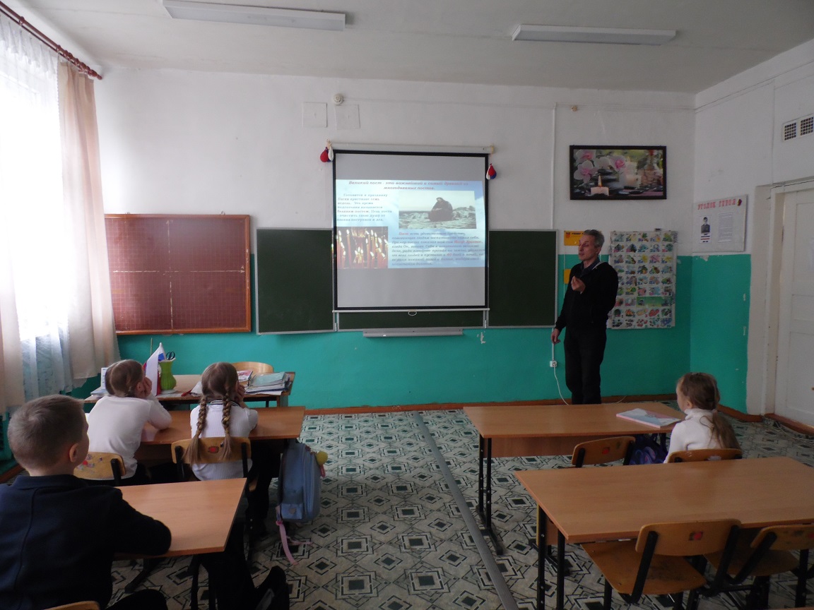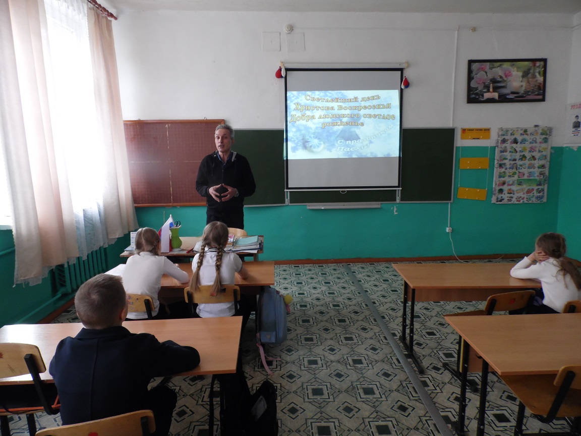 Заведующий библиотекой рассказал ученикам о возникновении, значении для всех православных людей этого светлого праздника – Христово Воскресение, или Пасха. Она символизирует обновление и спасение мира и человека, торжество жизни над смертью, добра и света над злом и тьмой. Также познакомил учеников с символами Пасхи в православии: Пасхальный кулич, символизирующий плоть Иисуса Христа, крашеные яйца, по преданию, именно Мария Магдалина вручила императору Тиберию яйцо — символ воскресения Христа – творожная пасха в виде усечённой пирамиды символизирует Голгофу или Гроб Господень.