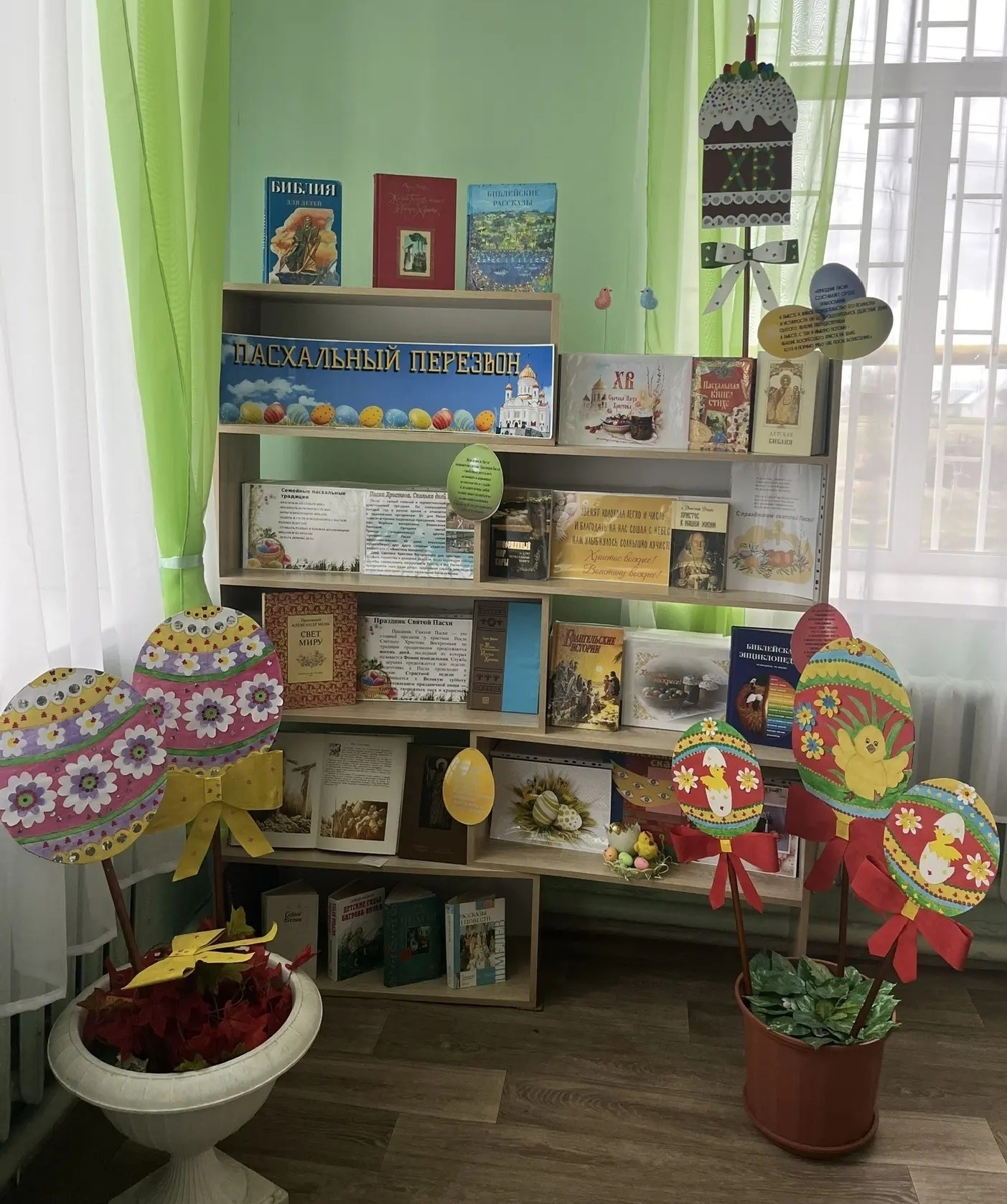Атмосферу светлой радости и духовно-нравственной чистоты подарила выставка «Пасхальный перезвон» жителям села Горелое, организованная в библиотеке. Наряду с книгами об истории и символах празднования Пасхи, о народных традициях и обычаях, на выставке представлены пасхальные атрибуты – крашеные яйца, веточки вербы, кулич и, конечно, цветы.