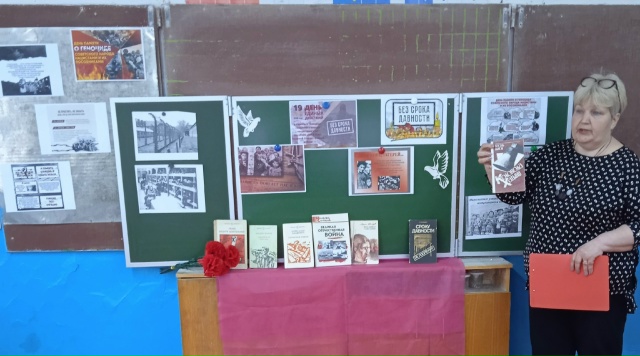 🕯Библиотекарь познакомила детей с понятием “геноцид”, узнали ребята о фактах массового уничтожения мирного населения фашистами, о лагерях смерти, о детском концлагере , который был в посёлке Вырица Ленинградской области. 🕯К мероприятию была подготовлена книжная выставка ” Без срока давности “